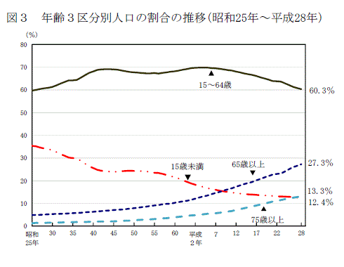 65歲以上的人口比重已經(jīng)上升至紀(jì)錄新高的27.3%,而15歲以下人口占比則跌至紀(jì)錄新低。15-64歲的勞動(dòng)力人口繼續(xù)下滑至60.3%,為1951年以來最低。