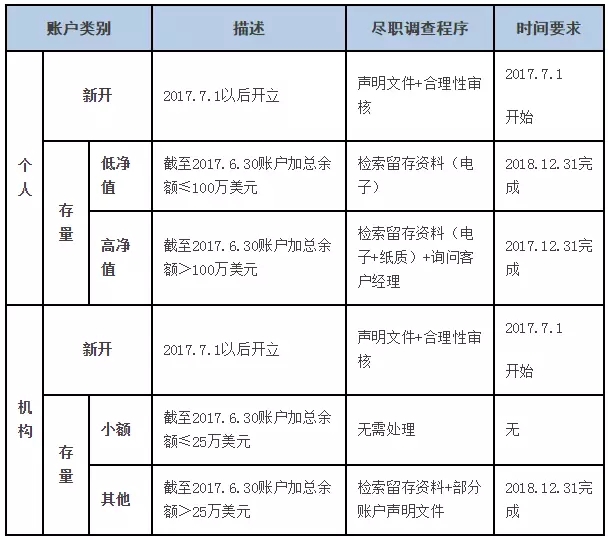 賬戶調查時間2017年12月31日前,完成對存量個人高凈值賬戶(截至2016年12月31日金融賬戶加總余額超過100萬美元)的盡職調查;